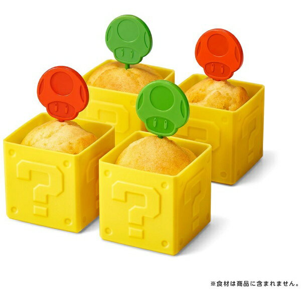 焼き菓子が作れるハテナブロック型のマフィンカップ4個と、スーパーキノコ型ピック2本、1UPキノコ型ピック2本のセットです。